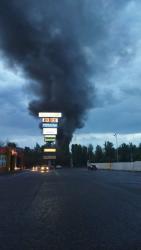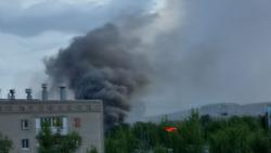 Огонь полыхает на всех четырех этажах. От горящего здания валит черный столб дыма, который виден за несколько кварталов.