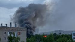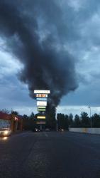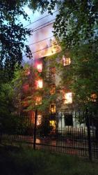 Огонь полыхает на всех четырех этажах. От горящего здания валит черный столб дыма, который виден за несколько кварталов.